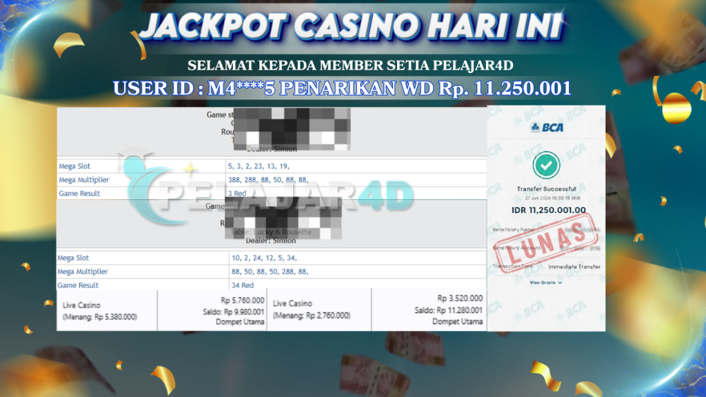 Dengan jutaan pengguna aktif, PELAJAR4D telah menjadi pilihan utama para pecinta permainan digital di tanah air. Platform kami di lengkapi dengan sistem enkripsi tingkat tinggi, proses transaksi yang cepat dan transparan, serta berbagai bonus dan promosi menarik setiap harinya untuk meningkatkan pengalaman bermain Anda.